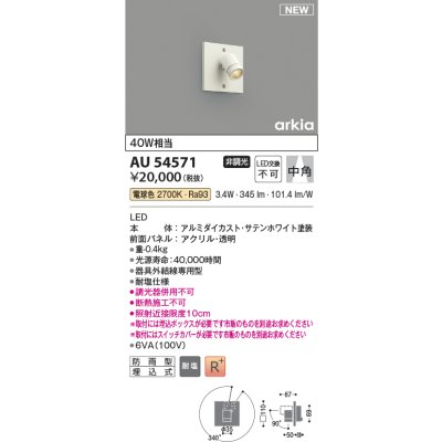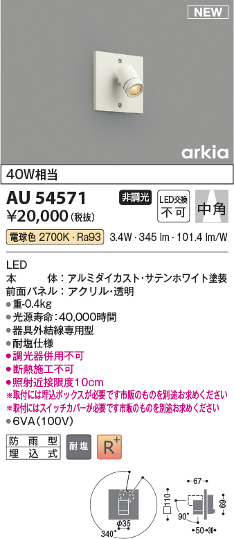 コイズミ照明 AU54571 スポットライト 非調光 LED一体型 電球色 中角 防雨型 サテンホワイト [au54571]