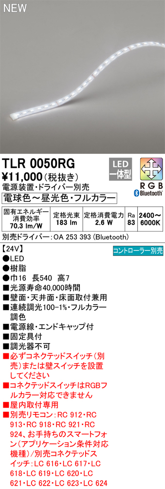 オーデリック TLR0050RG 間接照明 長540 テープライト トップビュータイプ フルカラー 調光調色 リモコン別売 電源装置・ドライバー別売 LED一体型 受注品 [§] [tlr0050rg]