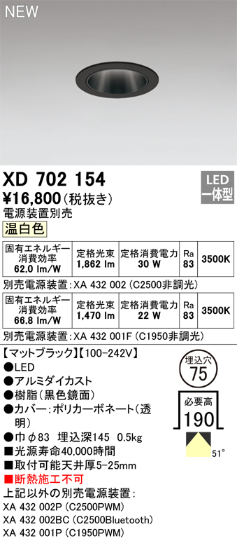 オーデリック XD702154 ダウンライト 埋込穴φ75 電源装置別売 LED一体型 温白色 マットブラック [xd702154]
