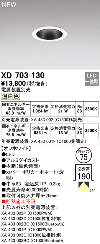 オーデリック XD703130 ダウンライト 埋込穴φ75 電源装置別売 LED一体型 温白色 オフホワイト