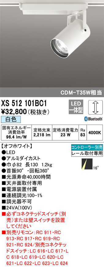 オーデリック XS512101BC1 スポットライト 調光 Bluetooth リモコン別売 LED一体型 レール取付専用 白色 オフホワイト [xs512101bc1]