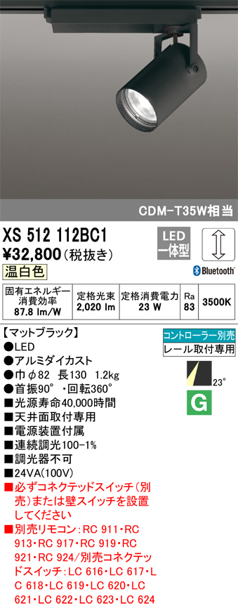 オーデリック XS512112BC1 スポットライト 調光 Bluetooth リモコン別売 LED一体型 レール取付専用 温白色 マットブラック