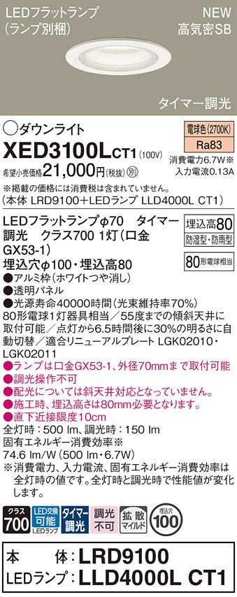 パナソニック XED3100LCT1(ランプ別梱) ダウンライト 埋込穴φ100 LED(電球色) 天井埋込型 軒下用 高気密SB形 拡散マイルド 防雨・防湿型 ホワイト