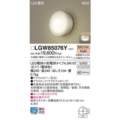 パナソニック LGW85076Y ポーチライト LED(電球色) 天井・壁直付型 密閉型 LED電球交換型 防雨型 プラチナメタリック [lgw85076y]