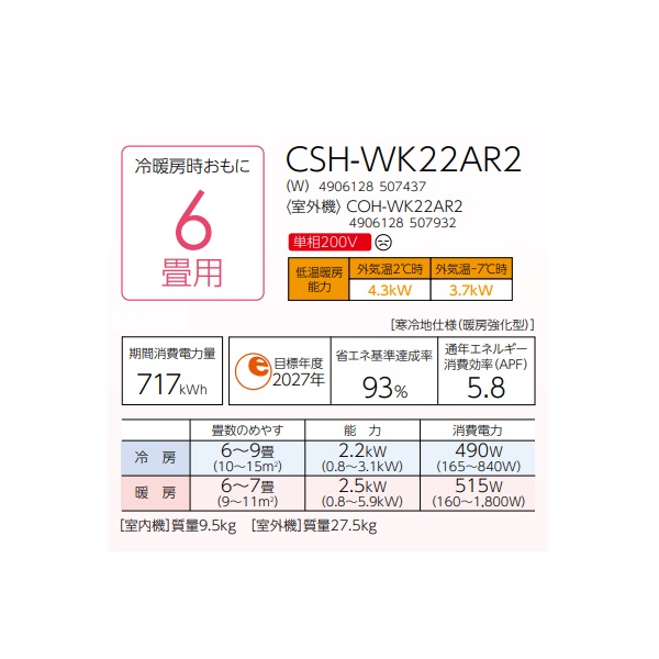 室内機:CSH-WK22AR2(W) 4906128507437