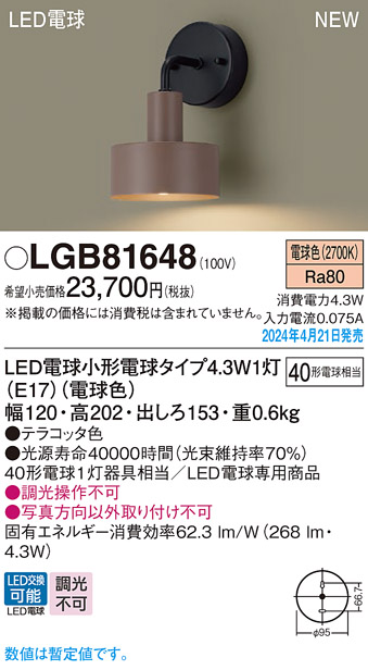 パナソニック LGB81648 ブラケット LED(電球色) 壁直付型 LED電球交換型 テラコッタ色 [lgb81648]