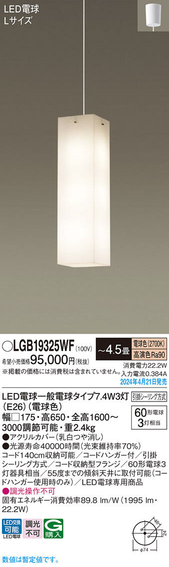 パナソニック LGB19325WF ペンダント 4.5畳 LED(電球色) 天井吊下型 吹き抜け用 引掛シーリング LED電球交換型 ホワイト