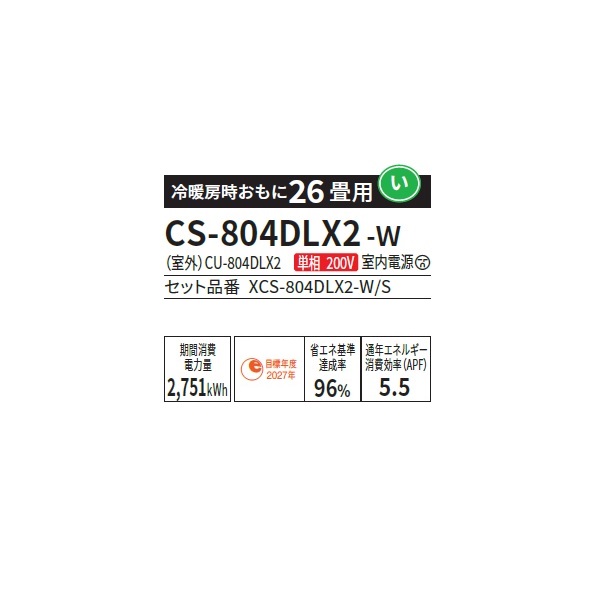 パナソニック CS-804DLX2-W エアコン 26畳 ルームエアコン LXシリーズ ナノイーX 単相200V 26畳程度 クリスタルホワイト (CS-803DLX2-Wの後継品) ♭