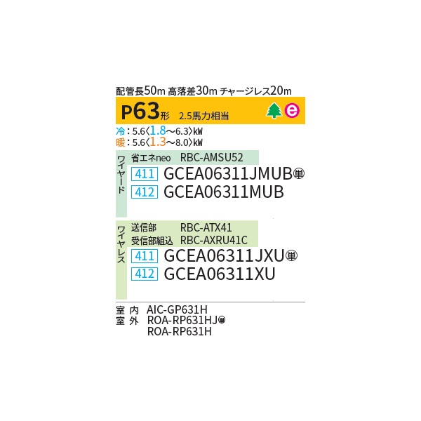 日本キヤリア/旧東芝 GCEA06311XU 業務用エアコン 天井吊形 スマートエコneo シングル P63 2.5馬力 三相200V ワイヤレス ♪∀