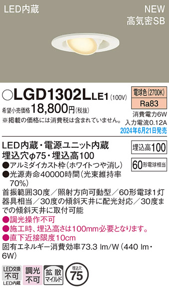 パナソニック LGD1302LLE1 ユニバーサルダウンライト 埋込穴φ75 LED(電球色) 天井埋込型 浅型10H 高気密SB形 拡散マイルド ホワイト