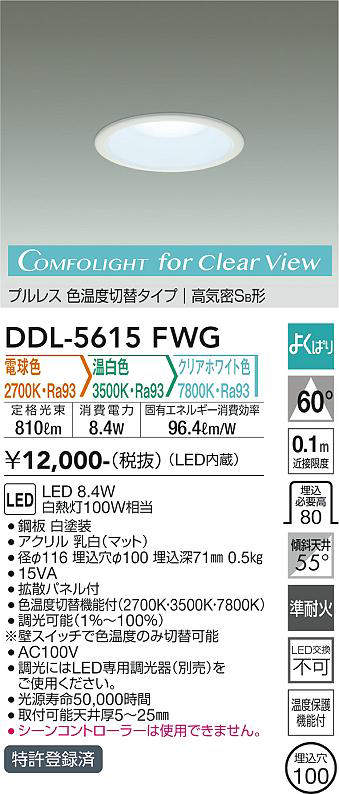 大光電機(DAIKO) DDL-5615 FWG ダウンライト 埋込穴φ100 よくばり(調光器別売) LED 電球色 温白色 クリアホワイト色 プルレス 高気密SB形 準耐火 ホワイト [ddl-5615fwg]