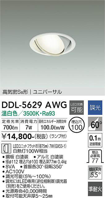 大光電機(DAIKO) DDL-5629 AWG ダウンライト 埋込穴φ100 調光(調光器別売) LED 温白色 ランプ付 高気密SB形 ユニバーサル ホワイト [ddl-5629awg]