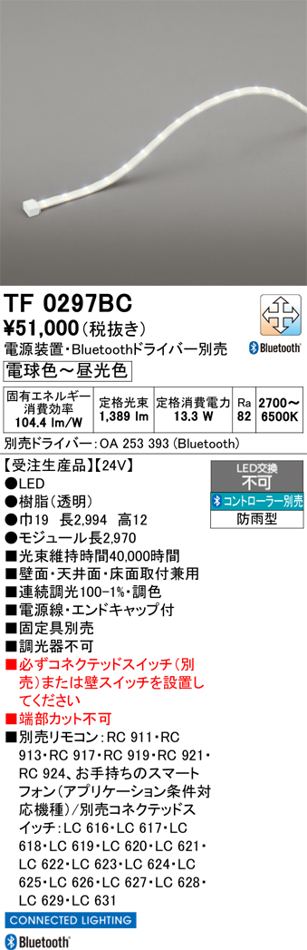 オーデリック TF0297BC 間接照明 テープライト 長2970 調光調色 Bluetooth リモコン・電源装置・ドライバー別売 LED一体型 電球色〜昼光色 防雨型 受注生産品 [§] [tf0297bc]