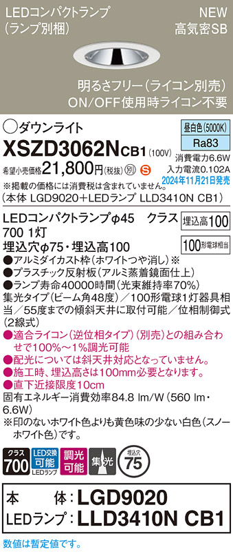 パナソニック XSZD3062NCB1(ランプ別梱) ダウンライト 埋込穴φ75 調光(ライコン別売) LED(昼白色) 天井埋込型 高気密SB形 集光48度 ランプ交換型 ホワイト [xszd3062ncb1]