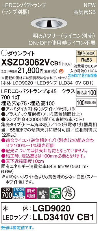 パナソニック XSZD3062VCB1(ランプ別梱) ダウンライト 埋込穴φ75 調光(ライコン別売) LED(温白色) 天井埋込型 高気密SB形 集光48度 ランプ交換型 ホワイト [xszd3062vcb1]