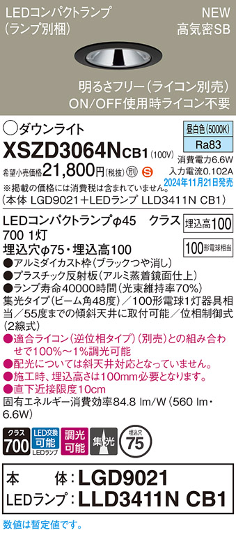 パナソニック XSZD3064NCB1(ランプ別梱) ダウンライト 埋込穴φ75 調光(ライコン別売) LED(昼白色) 天井埋込型 高気密SB形 集光48度 ランプ交換型 ブラック [xszd3064ncb1]