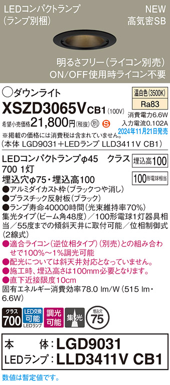 パナソニック XSZD3065VCB1(ランプ別梱) ダウンライト 埋込穴φ75 調光(ライコン別売) LED(温白色) 天井埋込型 高気密SB形 集光48度 ランプ交換型 ブラック [xszd3065vcb1]