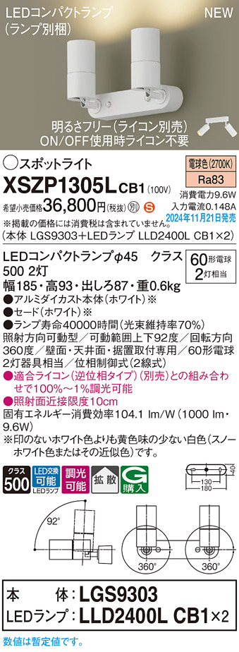 パナソニック XSZP1305LCB1(ランプ別梱) スポットライト 調光(ライコン別売) LED(電球色) 天井・壁直付型・据置取付型 拡散タイプ ランプ交換型 ホワイト [xszp1305lcb1]