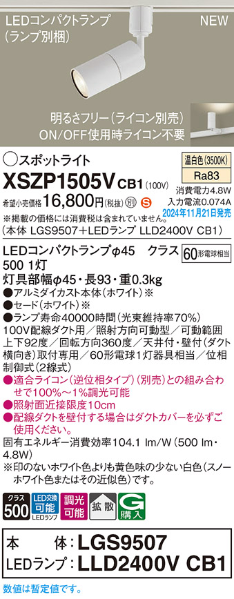 パナソニック XSZP1505VCB1(ランプ別梱) スポットライト 調光(ライコン別売) LED(温白色) 配線ダクト取付型 拡散タイプ ランプ交換型 ホワイト [xszp1505vcb1]