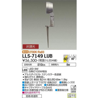 大光電機(DAIKO) LLS-7149LUB スポットライト 非調光 電球色 フラット ビーム角60度 フランジレススパイク 超広角形 防雨・防湿形 ステンカラー [lls-7149lub]