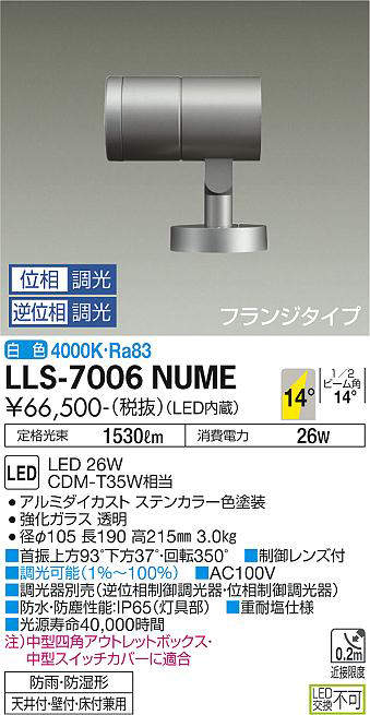 大光電機(DAIKO) LLS-7006NUME スポットライト 位相調光(調光器別売) 白色 ビーム角14度 フランジタイプ 防雨・防湿形 ステンカラー [lls-7006nume]