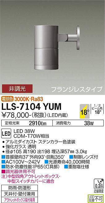 大光電機(DAIKO) LLS-7104YUM スポットライト 非調光 電球色 ビーム角18度 フランジレスタイプ 防雨・防湿形 ステンカラー [lls-7104yum]