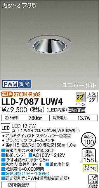 大光電機(DAIKO) LLD-7087LUW4 ユニバーサルダウンライト 埋込穴φ100 PWM調光(調光器別売) 電球色 ビーム角22度 広角形 防雨・防湿形 ステンカラー [lld-7087luw4]