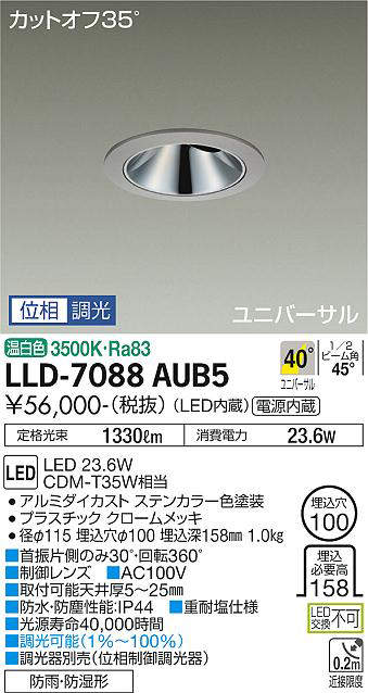 大光電機(DAIKO) LLD-7088AUB5 ユニバーサルダウンライト 埋込穴φ100 位相調光(調光器別売) 温白色 ビーム角40度 超広角形 防雨・防湿形 ステンカラー [lld-7088aub5]
