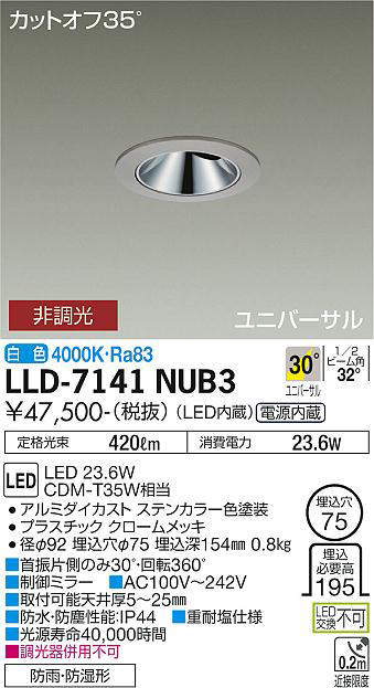 大光電機(DAIKO) LLD-7141NUB3 ユニバーサルダウンライト 埋込穴φ75 非調光 白色 ビーム角30度 超広角形 防雨・防湿形 ステンカラー