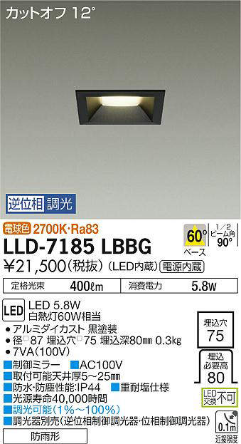 大光電機(DAIKO) LLD-7185LBBG ダウンライト 埋込穴φ75 位相調光(調光器別売) 電球色 角型 ビーム角60度 防雨形 黒 [lld-7185lbbg]