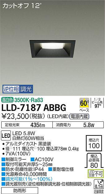 大光電機(DAIKO) LLD-7187ABBG ダウンライト 埋込穴φ100 位相調光(調光器別売) 白色 角型 ビーム角60度 防雨形 黒 [lld-7187abbg]