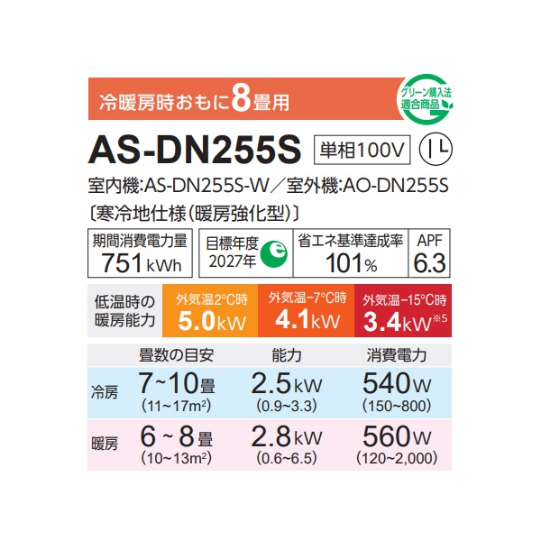 富士通 AS-DN255S エアコン 8畳 ルームエアコン DNシリーズノクリア ゴク暖 寒冷地仕様 単相100V 8畳程度 ホワイト (AS-DN254Rの後継品)