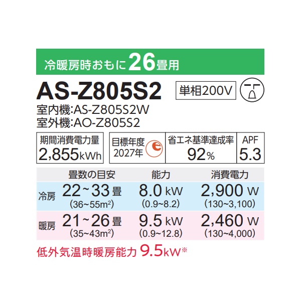 富士通 AS-Z805S2 エアコン 26畳 ルームエアコン Zシリーズ ノクリア 単相200V 26畳程度 ホワイト (AS-Z804R2の後継品) ♪