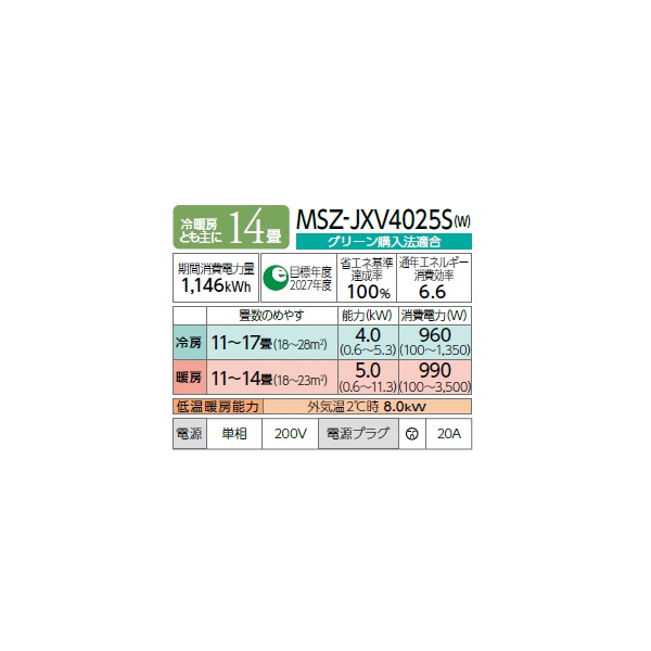 型番:MSZ-JXV4025S-W / MSZ-JXV4025S / MSZJXV4025S