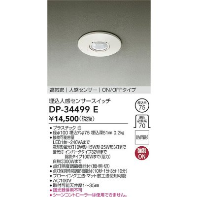 大光電機(DAIKO) DP-34499E 部材 高気密 埋込人感センサースイッチ ON/OFFタイプ 防雨型 ホワイト [dp-34499e]