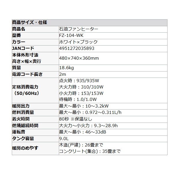ダイニチ Dainichi FZ-104-WK 石油ファンヒーター ホワイト×ブラック 大火力 パワフル 暖房器具 木造26畳 ℃℃ [fz-104-wk]