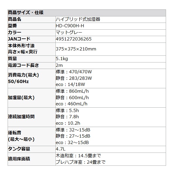 ダイニチ Dainichi HD-C900H-H ハイブリッド式加湿器 マットグレー プレハブ洋室24畳 木造和室14.5畳 ℃℃