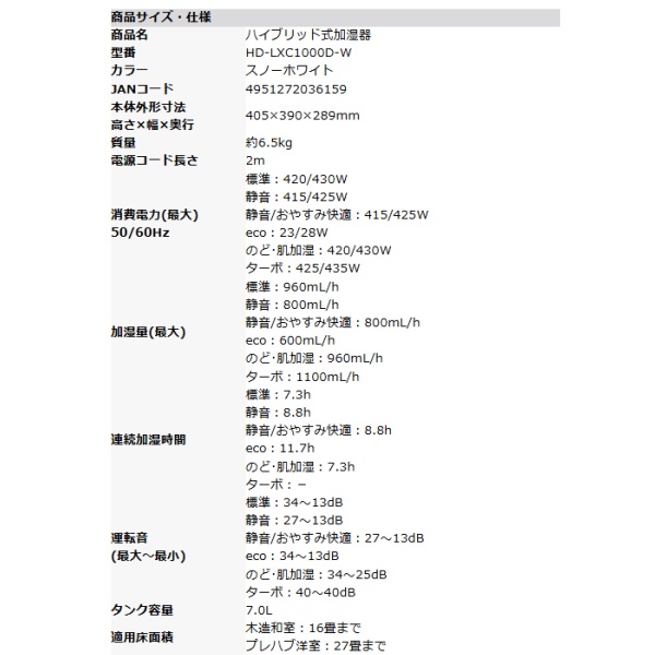 ダイニチ Dainichi HD-LXC1000D-W ハイブリッド式加湿器スノーホワイト プレハブ洋室27畳 木造和室16畳 大容量 ℃℃