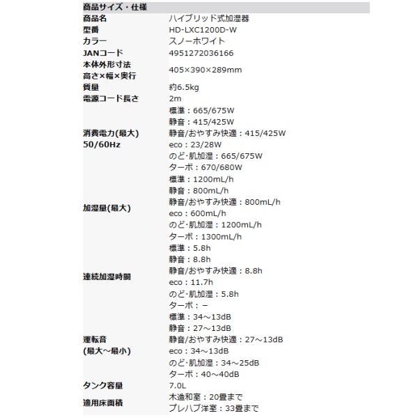 ダイニチ Dainichi HD-LXC1200D-W ハイブリッド式加湿器スノーホワイトプレハブ洋室33畳 木造和室20畳 ℃℃