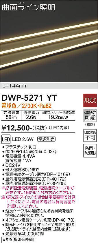 大光電機(DAIKO) DWP-5271YT 間接照明 屋内・屋外 曲面ライン 横曲げ LED内蔵 電源別売 非調光 電球色 防雨・防湿 L144mm [dwp-5271yt]