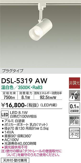 大光電機(DAIKO) DSL-5319AW スポットライト プラグタイプ LED内蔵 温白色 非調光 ホワイト 天井付・壁付兼用 [dsl-5319aw]